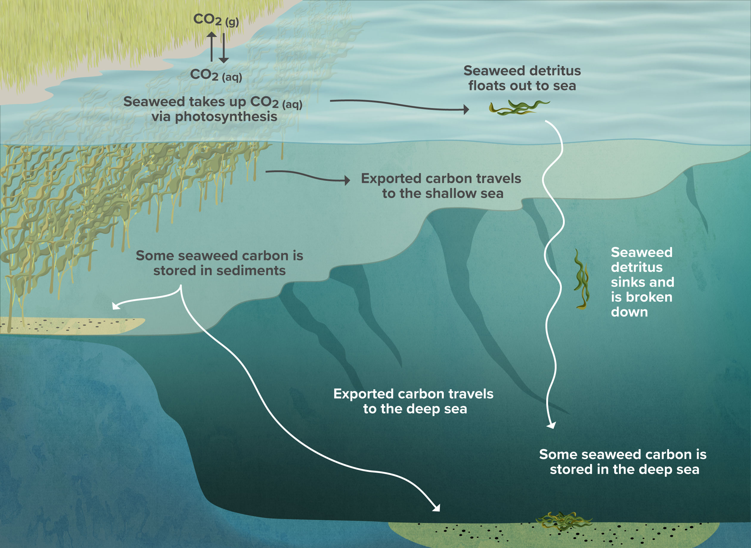 Figure 2. Overview of a seaweed ecosystem showing carbon fluxes into and out of the ecosystem that can result in carbon removal. Some carbon is exported to the shallow sea, where it may be recycled or persist for longer periods depending on its form, some is exported to the deep sea (~1000 m), and some is buried in seafloor sediments.